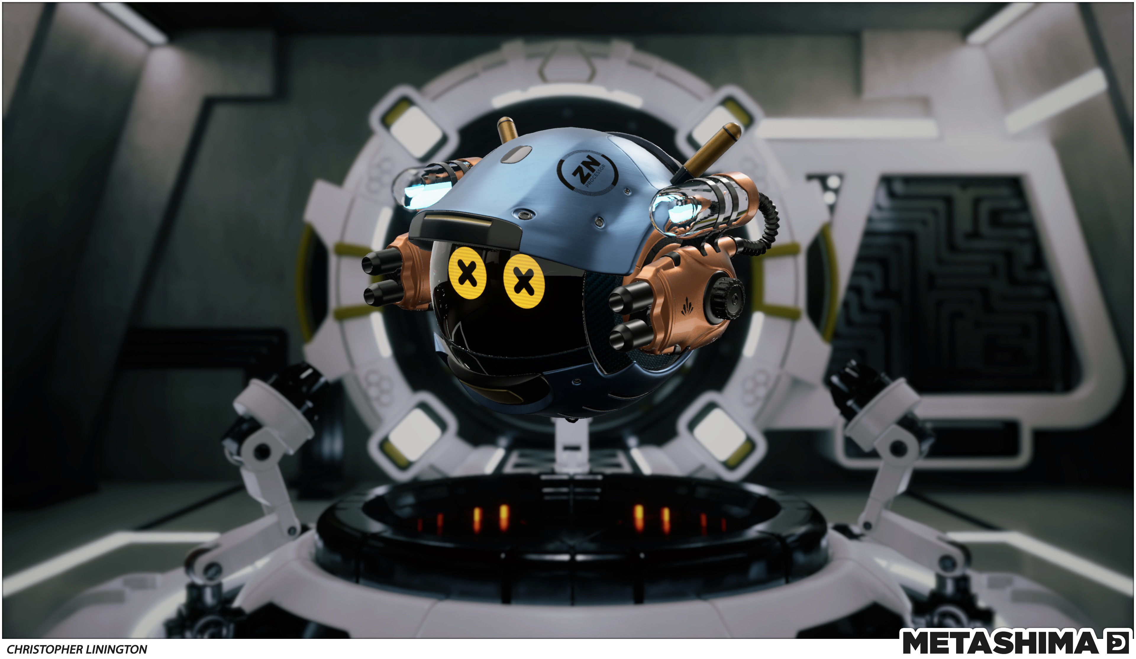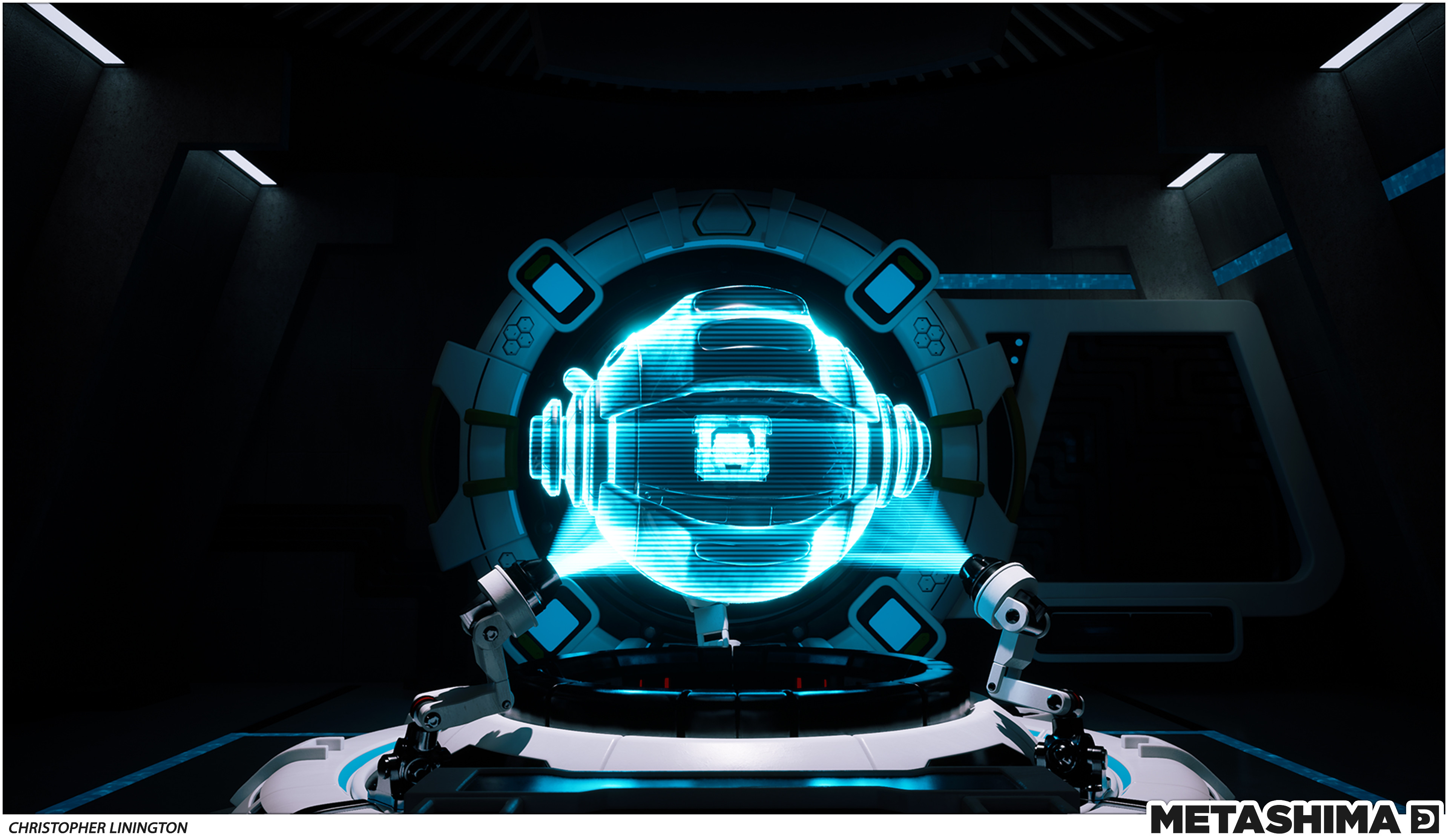 TASKS: Collaborated with a small team of artists to concept, model and unwrap high-poly subdivision meshes, create the holographic shader and world build the environment. Also collaborated with an artist to concept and create the “Metashima AP1” weapons accessories shown attached to the Metashima throughout.